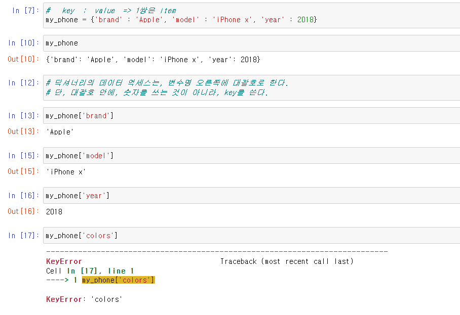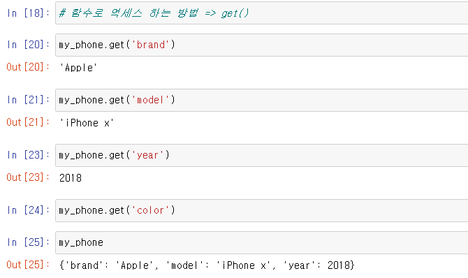 변수 my_phone에 얻고자하는 밸류의 키 값인 brand, model, year를 쓰면 그와 매칭되는 key 값이 리턴된다.