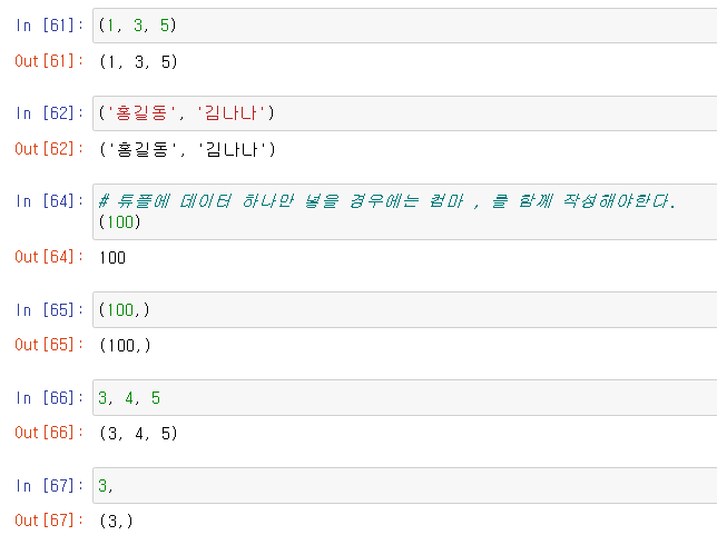 컴마와 함께 작성하지 않으면 튜플의 모양이 깨지게 된다.
