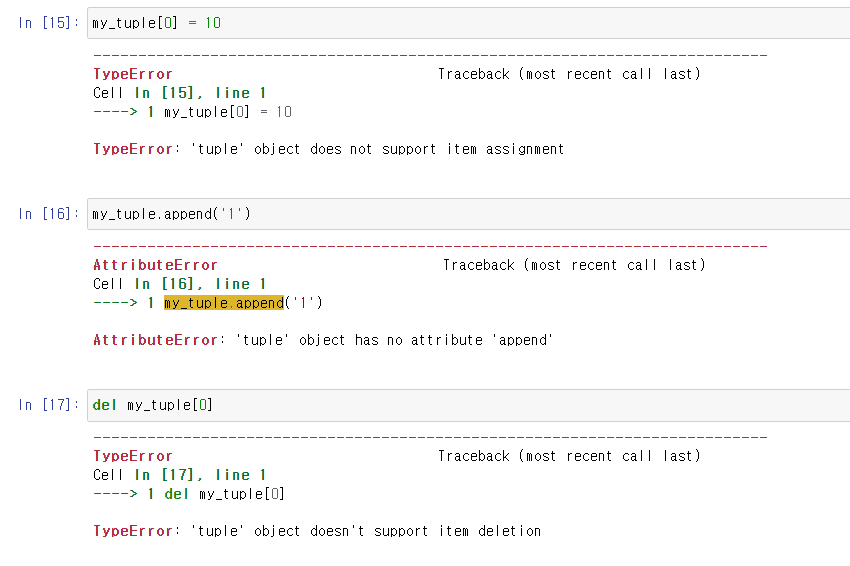 그렇기 때문에 아래와같이 튜플을 수정, 추가, 삭제를 하려고 하면 오류를 리턴한다.