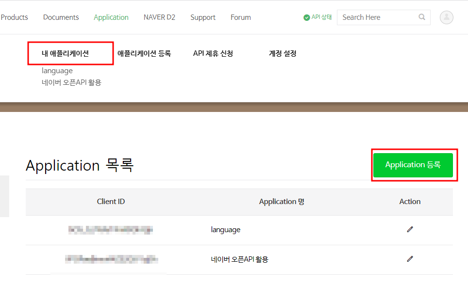애플리케이션 등록 (API) 이용 신청은 아래처럼 하였다.