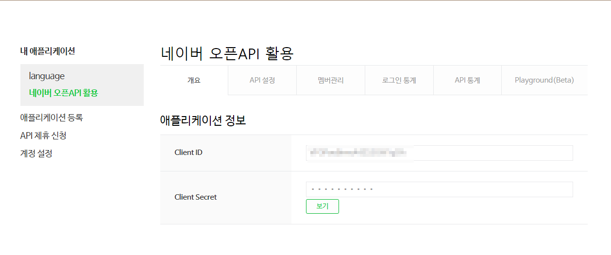 필요한 항목들을 모두 설정하고 나면, 오픈 API 활용에 필요한 Client ID 와 Client Secret 키를 발급해준다.
