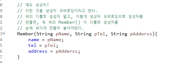 생성자 오버로딩으로 생성자를 만들면, 꼭 위에 Member() 이 디폴트 생성자를 눈에 보이게 만들어둬야한다.