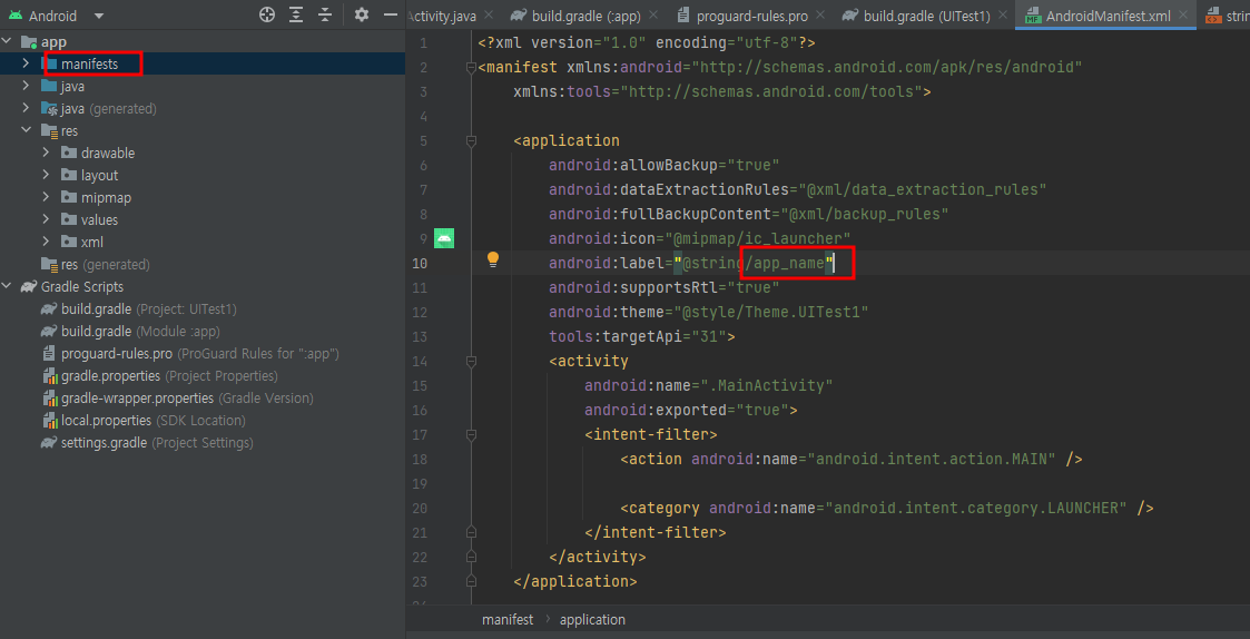 manifests 파일로 이동하여서 android 의 app_name 으로 이동한다.