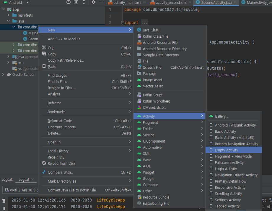 New - Activity - Empty Activity 를 선택하여 두번째 액티비티를 생성한다.