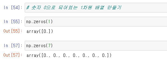 np.zeros() 함수 안에 만들고자 하는 행렬의 수를 넣어주면 된다. 괄호 안에 들어가는 수는 튜플 형식으로 입력되어야 한다.