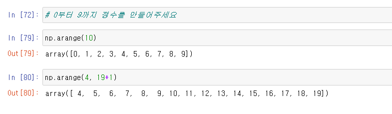 정수의 배열을 얻고자 할 때는 np.arange() 를 이용한다
