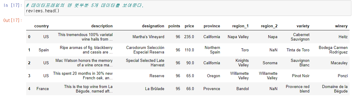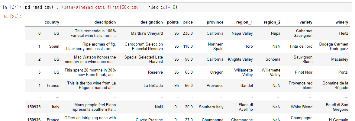 아래처럼 winemag-data_first150k.csv 파일을 불러오기 위해서는 pd.read_csv 파일을 이용하여야한다