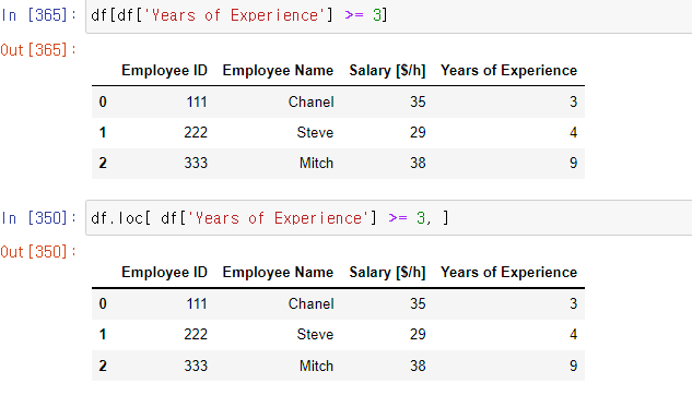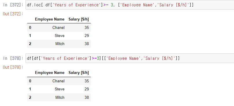 그리고 두번째 방법인 df[df['Years of Experience']>=3][['Employee Name','Salary [$/h]']] 에서는