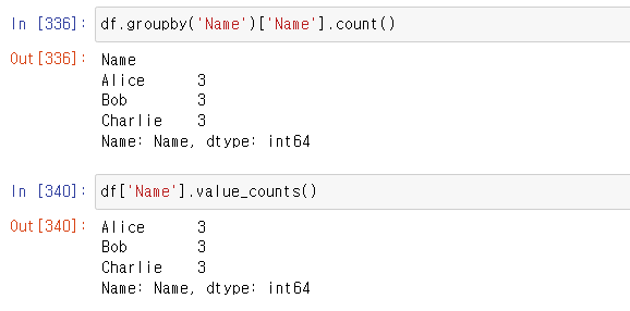 결과는 df.groupby('Name')['Name'].count() 와 같은 형태가 나온다.