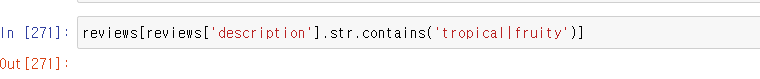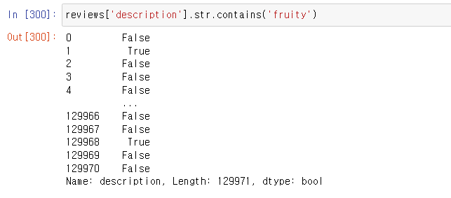 아래 예시는 reviews['description'] 컬럼에 'fruity' 라는 문자열이 포함되어있는지 확인하는 내용이다.