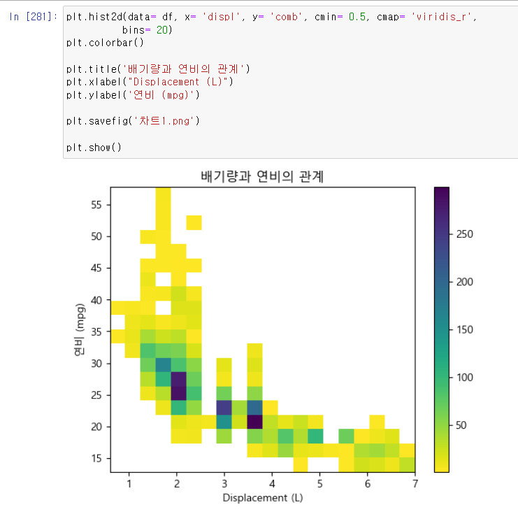 만약 원하는 컬럼들의 상관계수만 출력하고자 한다면, df[['displ','comb']].corr() 와 같이 리스트 형식으로 corr() 함수를 이용하면 된다.