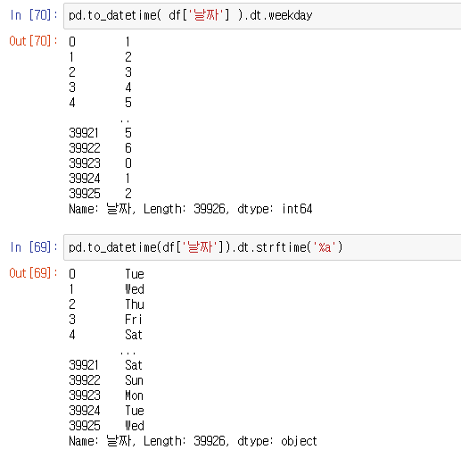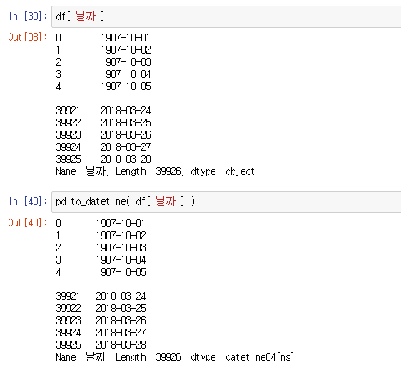 df['날짜'] 컬럼을 예시로 들었을 때, pd.to_datetime( df['날짜'] ) 를 해주면 dtype이 object 에서 datetime64 로 바뀐 것이 보인다.