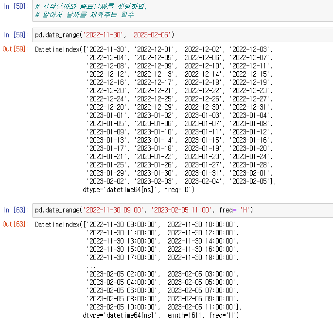 괄호 안에 시작 날짜와 종료 날짜를 넣어주고, 반환받고자 하는 형태가 있다면 freq 파라미터를 이용하여 원하는 형태를 넣어주면 된다.