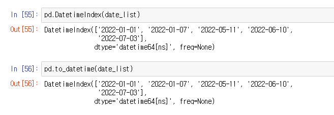 pd.DatetimeIndex() 또는 pd.to_datetime() 을 이용하면 리스트를 한번에 파이썬의 날짜 형식으로 바꿀 수 있다.