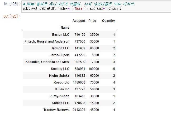pd.pivot_table() 을 이용하여서 동일한 컬럼명의 수치 데이터들을 합치는 결과를 리턴할 수 있다.