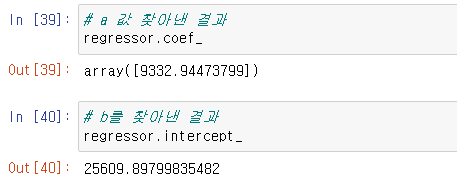 a 값을 찾을 때는 regressor.coef_ 를 이용하고, b는 regressor.intercept_ 를 이용하여 값을 리턴받을 수 있다.