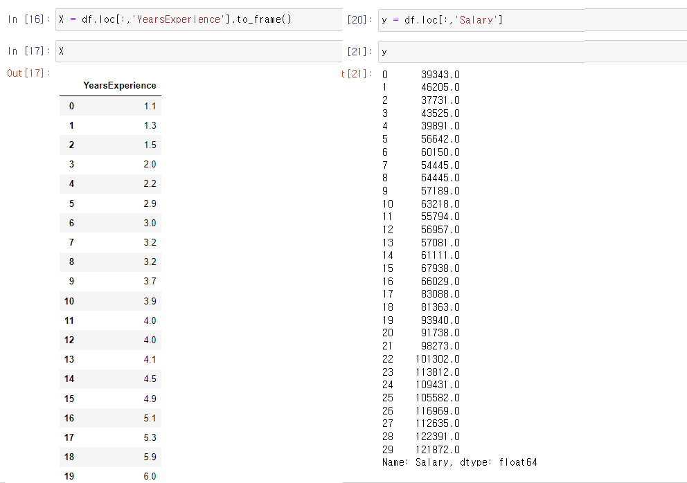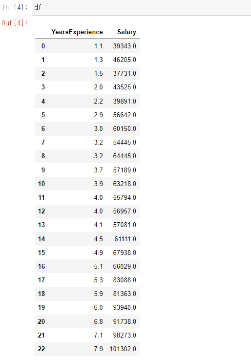 아래 데이터프레임에서 YearExperience에 대한 Salary 의 데이터 값을 인공지능으로 예측할 것이다.