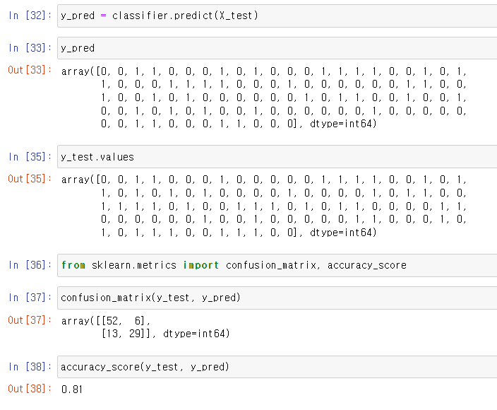 그 후 confusion_matrix 와 accuracy_score 로 정확도를 분석하면 아래와같은 결과값이 도출된다.