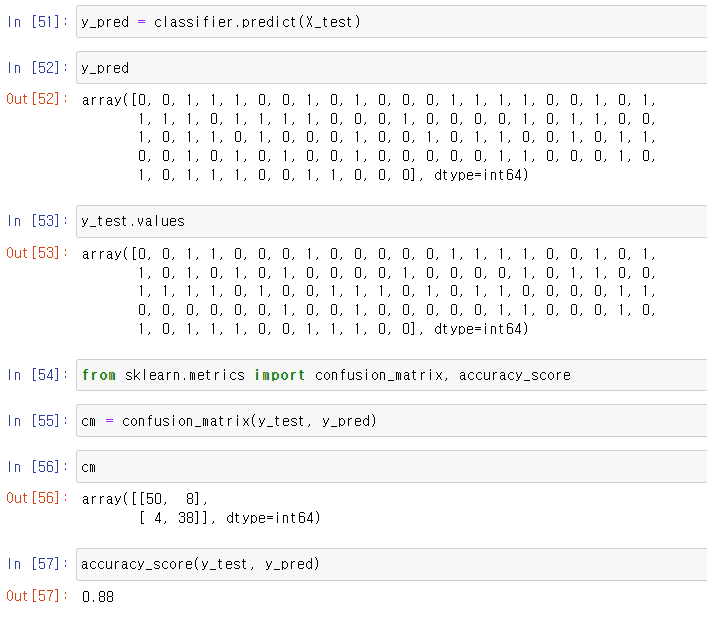 confusion_matrix, accuracy_score 를 이용하여서 y_test 와 y_pred 의 값을 비교하여 정확도를 계산한 결과이다