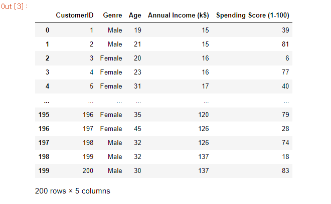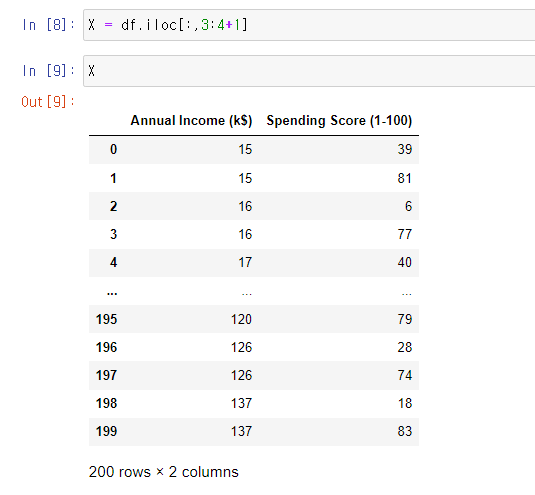수입과 지출 데이터가 들어있는'Annual Income (k$)' 과 'Spending Score (1-100)' 컬럼을 변수 X 로 두었다.