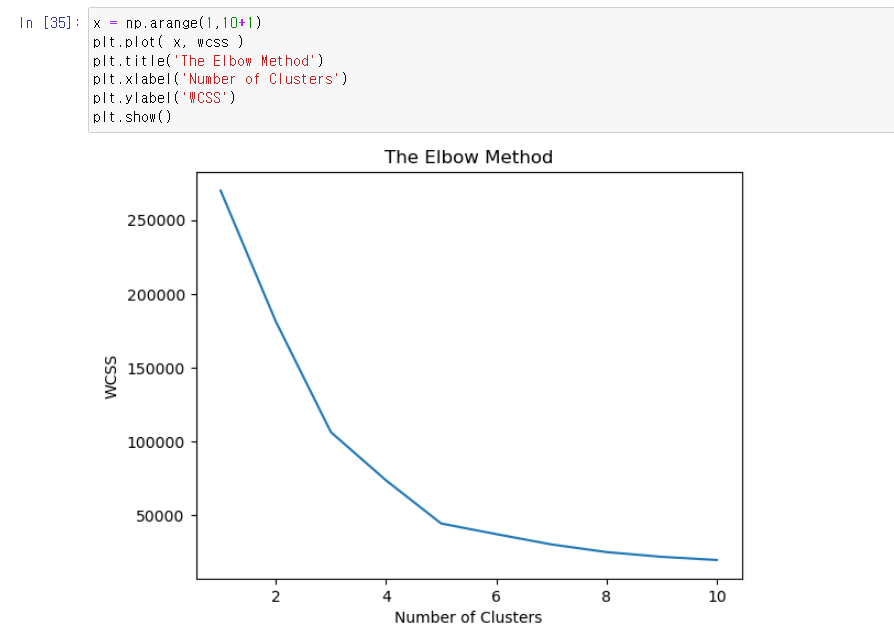 이제 각 클러스터의 갯수마다 구한 wcss 값을 차트로 나타낸다. => 이것을 엘보우 메소드라고 한다.