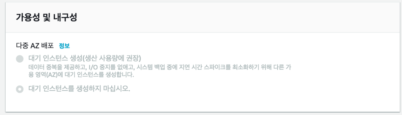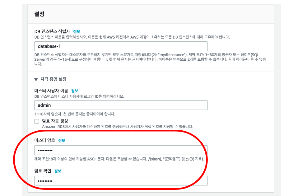 DB 인스턴스 식별자에서 DB 이름을 설정해주고, 마스터 사용자 이름과 암호를 생성해준다.