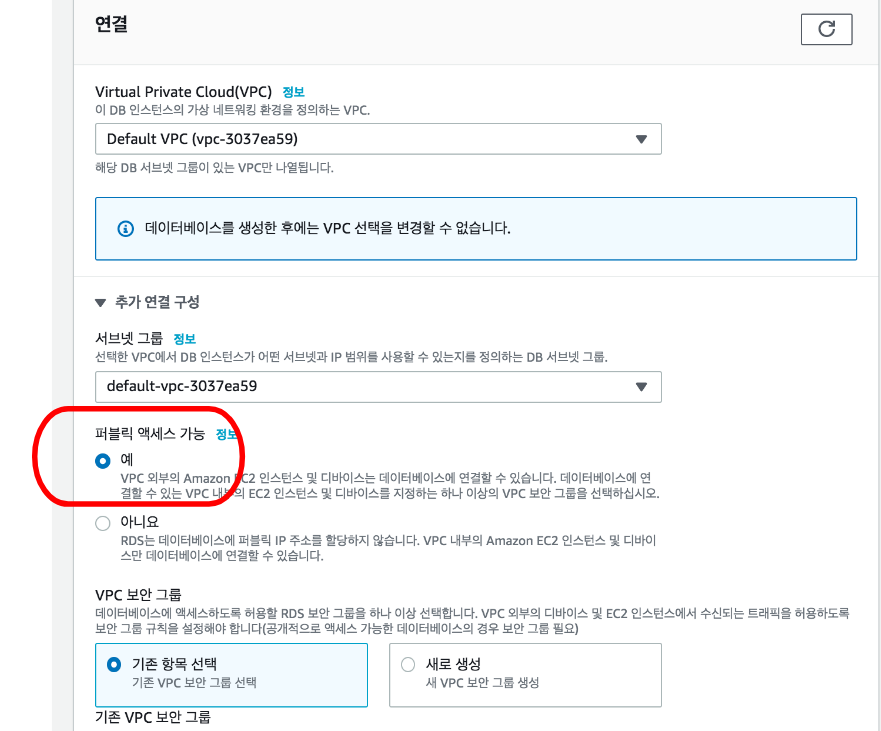 어느 위치에서든 데이터베이스에 로그인하여서 사용하기 위해서는, 퍼블릭 억세스 가능을 예로 설정해 주어야한다.
