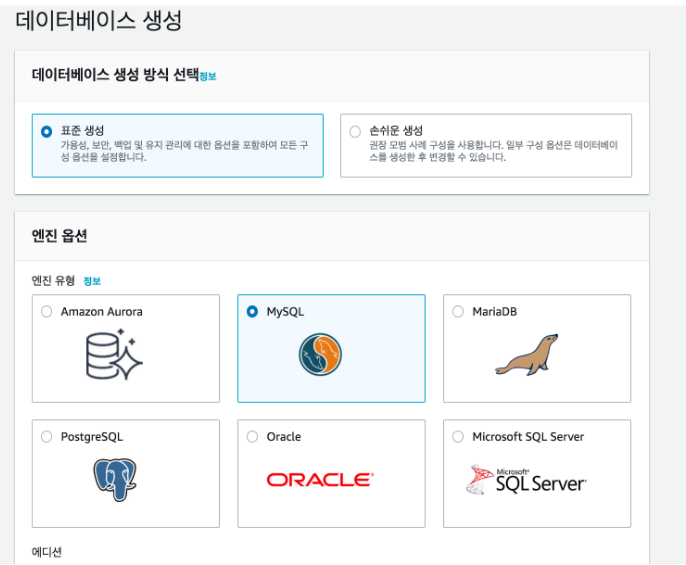 데이터베이스 생성 방식 선택에서 표준 생성을 선택해준다.