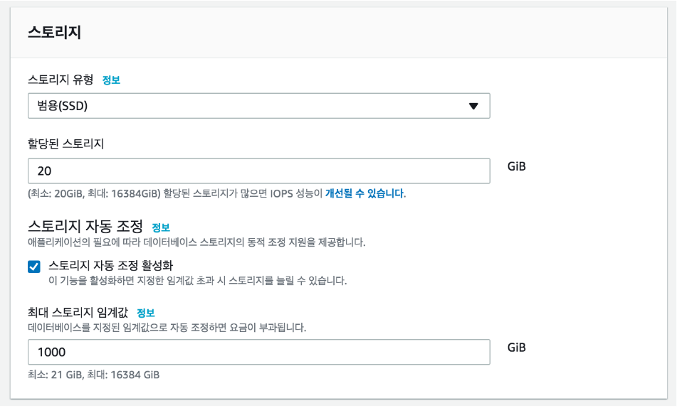 이 부분도 건들 것이 없다. 무료로 사용하기 위해서는 할당된 스토리지는 꼭 20 기가로 설정해주어야 한다.
