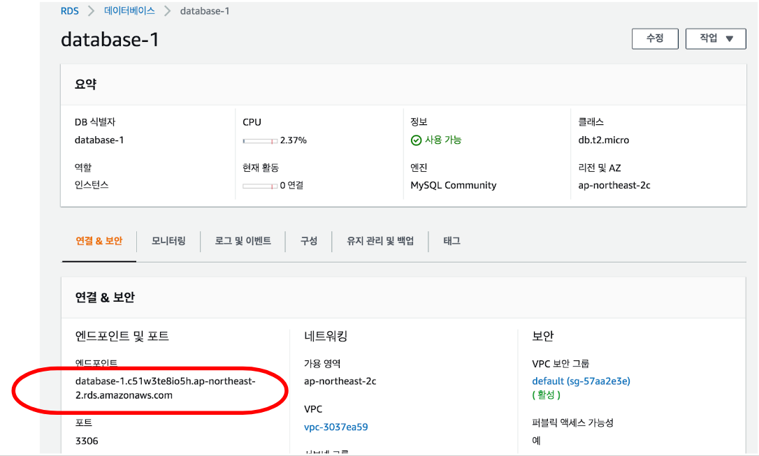 아래에 있는 엔드포인트가 MySQL workbench 를 이용할 때 필요한 내용이다.