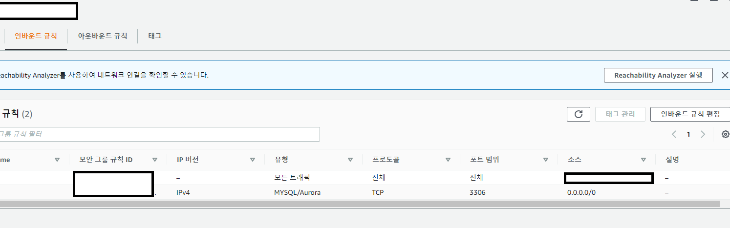 규칙 추가버튼을 눌러서 새로추가된 규칙의 유형을 MYSQL/Aurora 를 클릭해주고 소스는Ipv4 를 눌러서 설정해주면, 이제 SQL 과 연결이 될것이다.