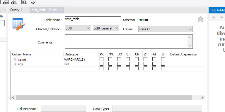 age 컬럼에는 숫자가 들어가야 하기때문에, Datatype 은 int 형으로 설정해주고 오른쪽 사각박스들은 전부 체크를 안한 상태로 apply 를 하면 test_table 명의 새로운 테이블이 생성된다.