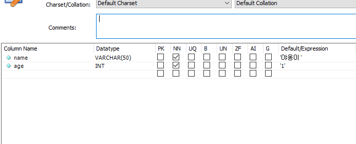 컬럼 name 또는 age 에 빈 데이터를 넣었을 경우 아래처럼 자동으로 name 컬럼에는 야옹이, age 컬럼에는 int 형 1 데이터가 채워진 것을 볼 수 있다.