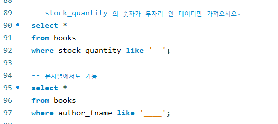 만약 두자리 수의 데이터를 가져오고자 한다면 like '__' 로 따옴표 안에 _ 를 두개 적어주면 된다.