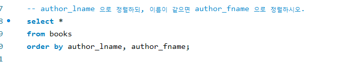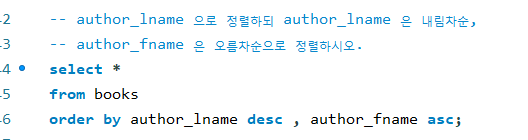 아래의 예시에서는 author_lname 으로 먼저 정렬을 한 후, author_lname 에 동일한 데이터가 있으면 다른 컬럼인 author_fname 으로 정렬하게 한 내용이다.