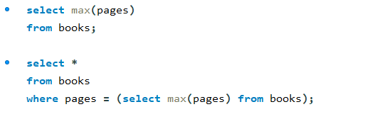 먼저 select max(pages) from books; 를 해서 최대값을 가져온 후