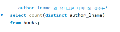 유니크한 데이터의 갯수를 구할 때는, distinct 키워드를 이용하여서 count () 해주어야한다.