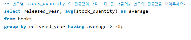 아래의 예시에서는 group by로 컬럼 released_year 를 묶고 그 컬럼의 데이터들의 평균이 70 이상인 데이터들만 리턴하도록 하였다.