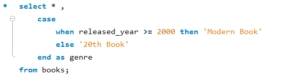 when 절에서 released_year 컬럼의 데이터 값이 2000 이상이면 새로운 컬럼에 'Modern Book' 데이터를 넣고, 그렇지 않으면 '20th Book' 데이터를 넣도록 하였다.
